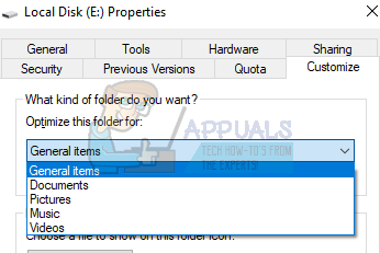 - Once in the properties, navigate to the Customize tab. Here you will see a tab named as “Optimize this folder for”. Click it for the drop-down. Now select the file format.