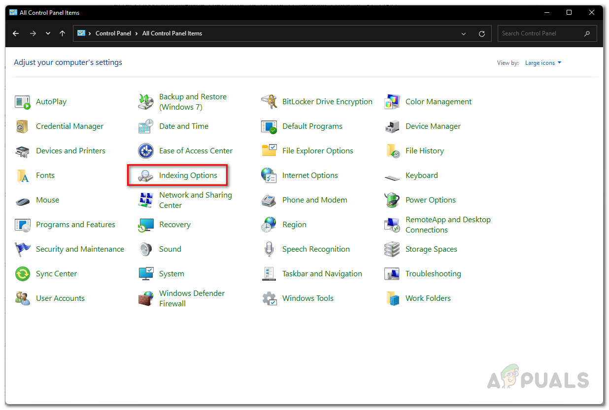 Changing Control Panel View By - Now, from the options shown, click on the Indexing Options option shown.