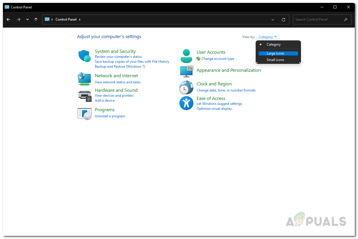 Opening up Control Panel - When the Control Panel window is open, click on the View by drop-down menu at the top and then choose Large icons.
