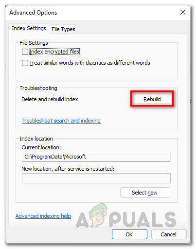 Changing File Index - After that, switch to the Index Settings tab and click the Rebuild option provided.