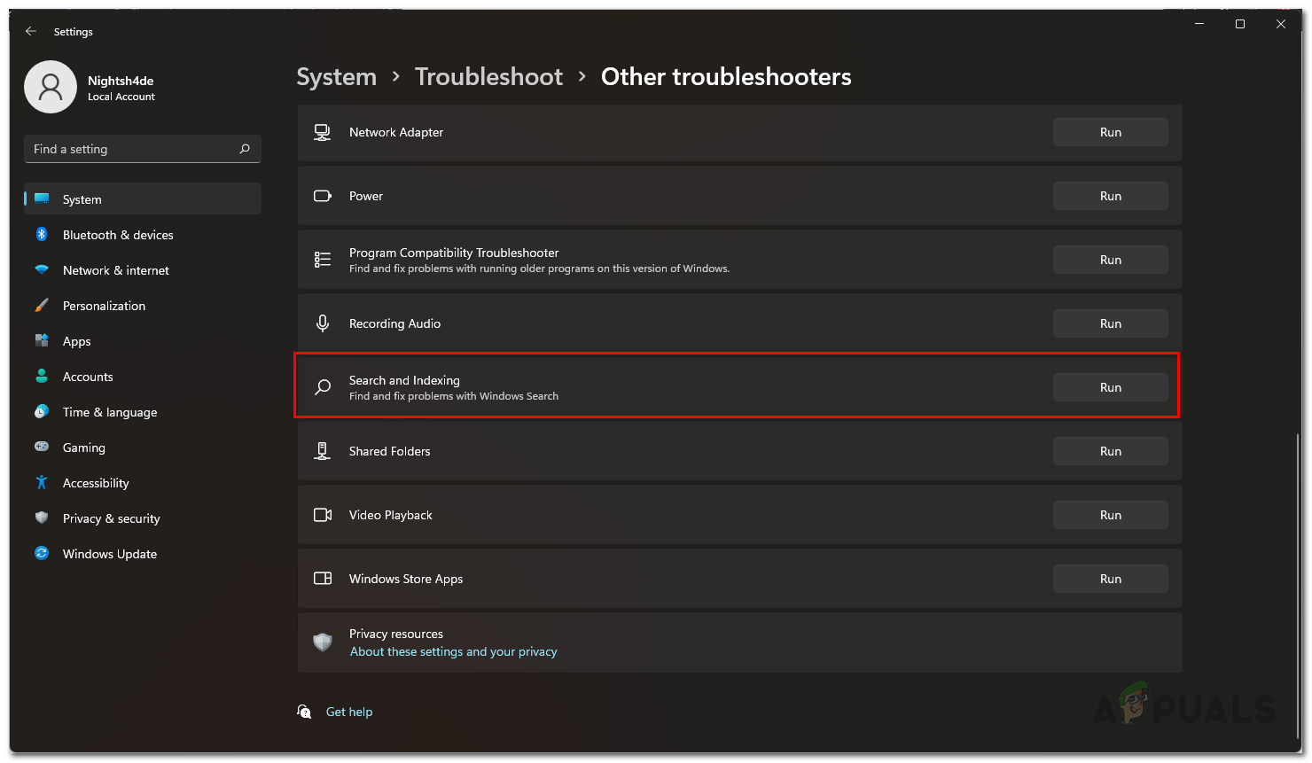 Running Search and Indexing Troubleshooter - Click the Run button next to it to run the troubleshooter.