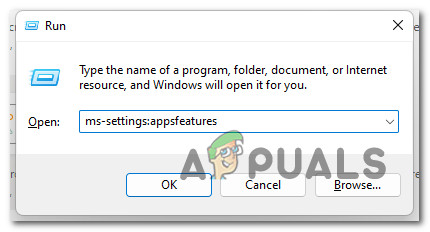 - Next, type “ms-settings:appsfeatures” and press Enter to open up the Apps & Features menu of the Settings app.