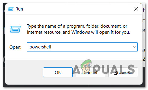 - Press Windows key + R to open up a Run dialog box. Inside the text box, type ‘powershell’ inside the text box and press Ctrl + Shift + Enter to open the terminal with admin access.