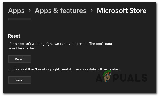 - Corrupted Temporary files affecting Microsoft Store – As it turns out, this problem can also be rooted in a glitch caused by several corrupted temporary files that Microsoft Store has accumulated as you kept using it. In this case, you should attempt to perform a reset on the store component and see if the issue is resolved.