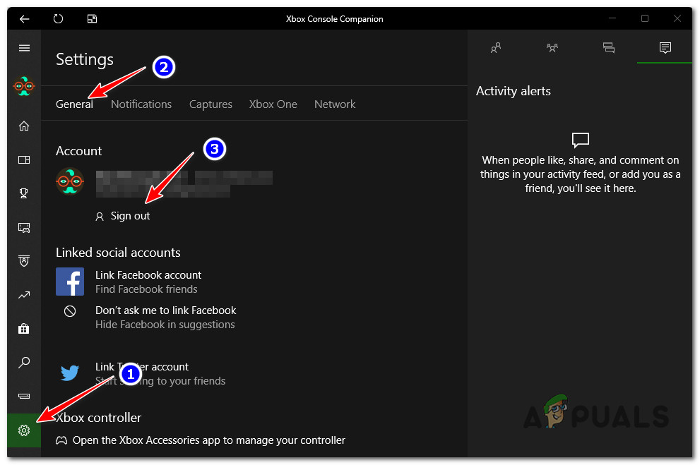- Next, open up the Xbox Console Companion app and sign out of the account that you’re currently connected with. You can do this by clicking on the gear icon (bottom-left corner), then selecting the General tab, and clicking on Sign out (under Account).