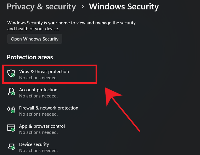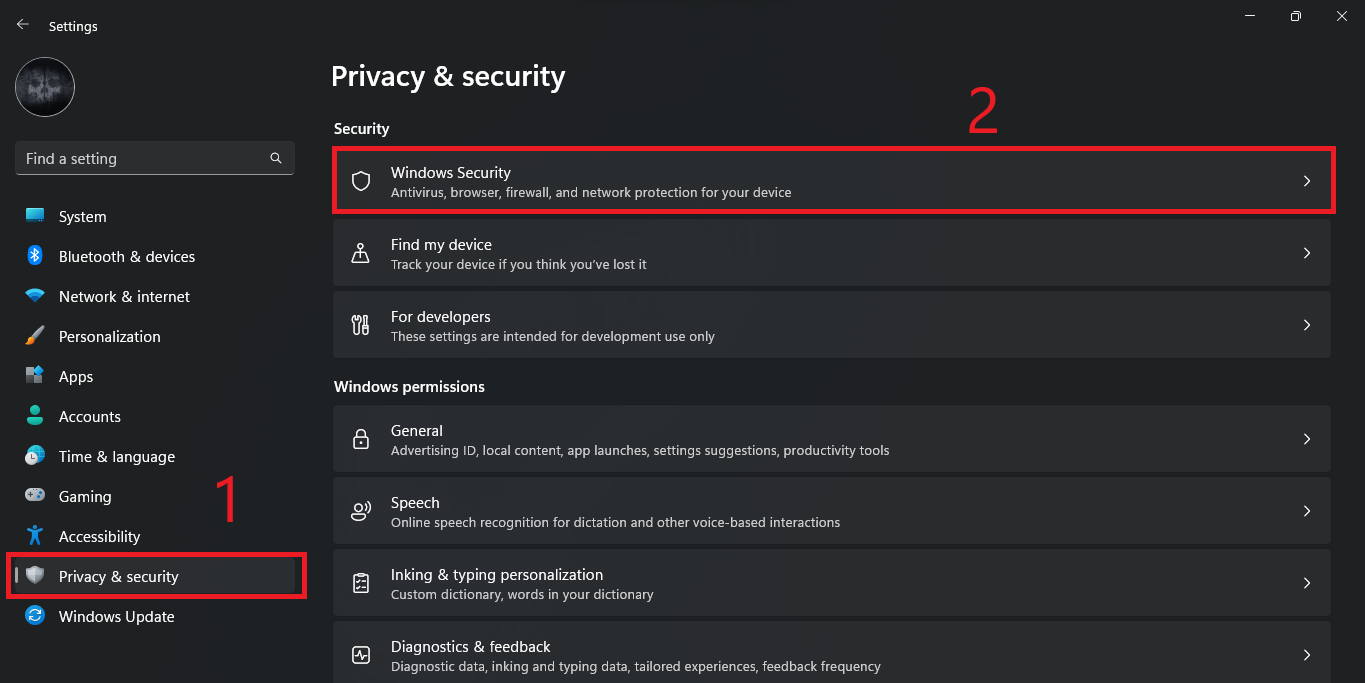 - Go to Privacy & Security → Windows Security.