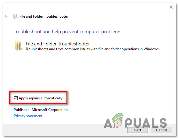 - Folder permission issue – This problem can also occur due to a folder permission issue that can be automatically corrected by running the File and Folder troubleshooter. This fix was confirmed to be effective by several different users that were previously seeing the problem on Windows 10.