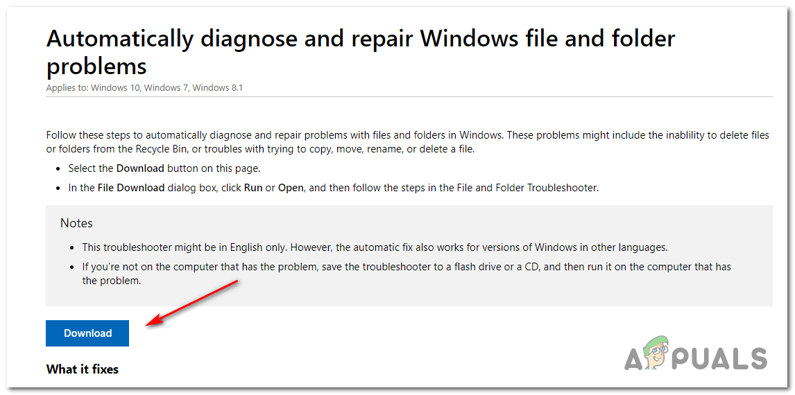 - Open your default browser and access the download page of the Windows File & Folder troubleshooter and click on the download button.