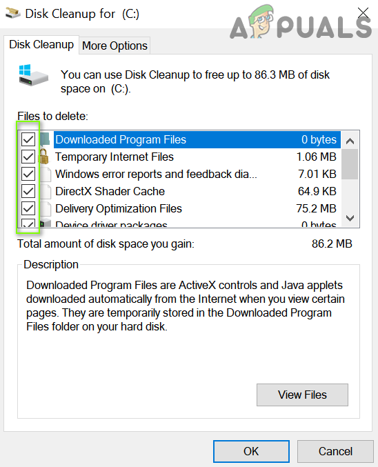 Click Disk Cleanup in the System Drive’s Properties - Now select all the checkboxes (except the essential types of files that you want to keep e.g., the Downloads folder) and click on the OK button.