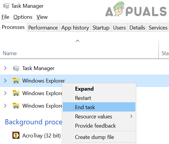 - Then, right-click the Windows Explorer process and choose End Task.