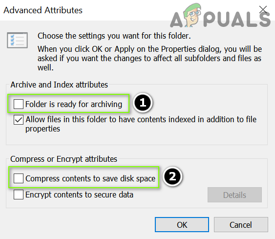 Uncheck “Folder is Ready for Archiving” and “Compress Contents to Save Disk Space” - Now apply the changes (if the issue is with more than one folder, repeat the above procedure on all such folders) and reboot your PC to check if the compression issue is resolved.