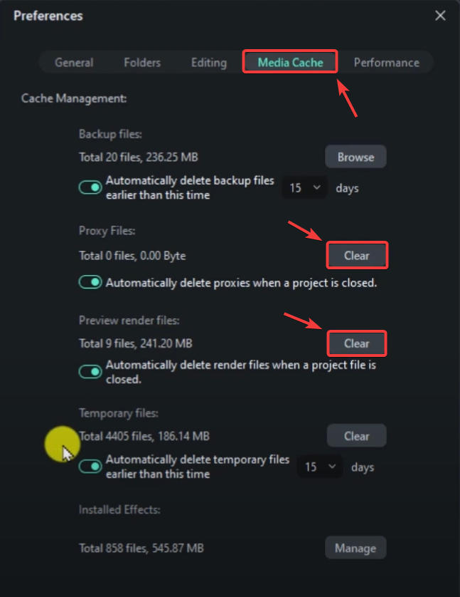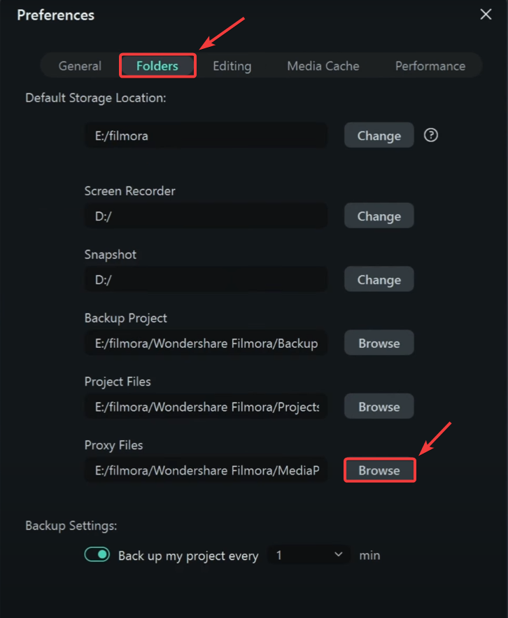 By default, Filmora saves temporary and proxy files on your system drive (C:). If that drive is full, Filmora cannot create new render or preview files. Moving these to a drive with more space resolves the issue.