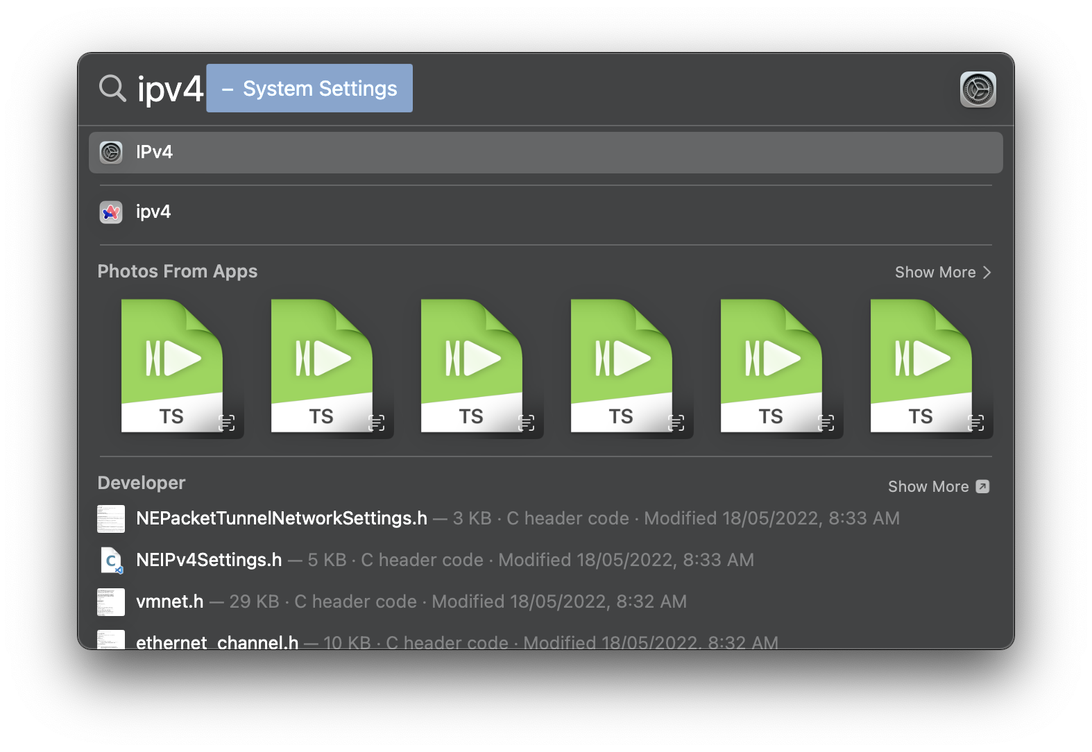 - Press Command + Spacebar to open Spotlight Search and type in IPv4. Press Enter.