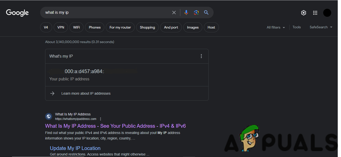 When it comes to locating your public IP address the process is very simple. When you connect to the internet and interact with a browser or website, they access your public IP. Hence, regardless of the device (Windows or Mac) simple open your browswer and search “What’s my IP?.” On the new page that loads up your public IPv4 or IPv6 address will be displayed.