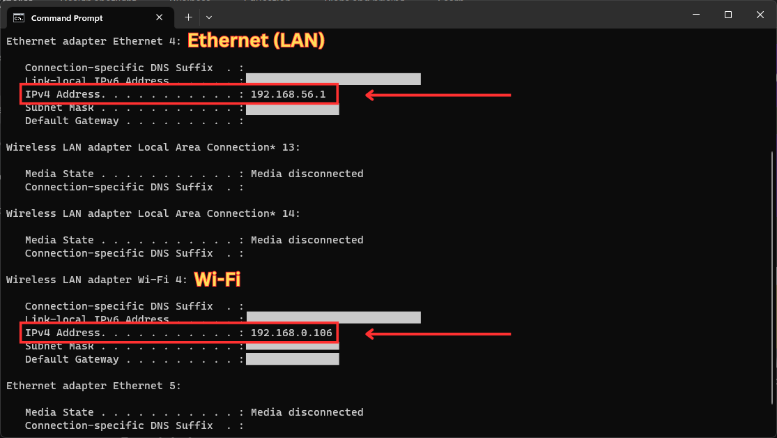 Your IP address Make sure you check the IP address of the network adapter currently in use. For example, in the picture above there are two IP addresses; the first one is for ethernet, and the second one is for the Wi-Fi. Most computers will only have one at a time.