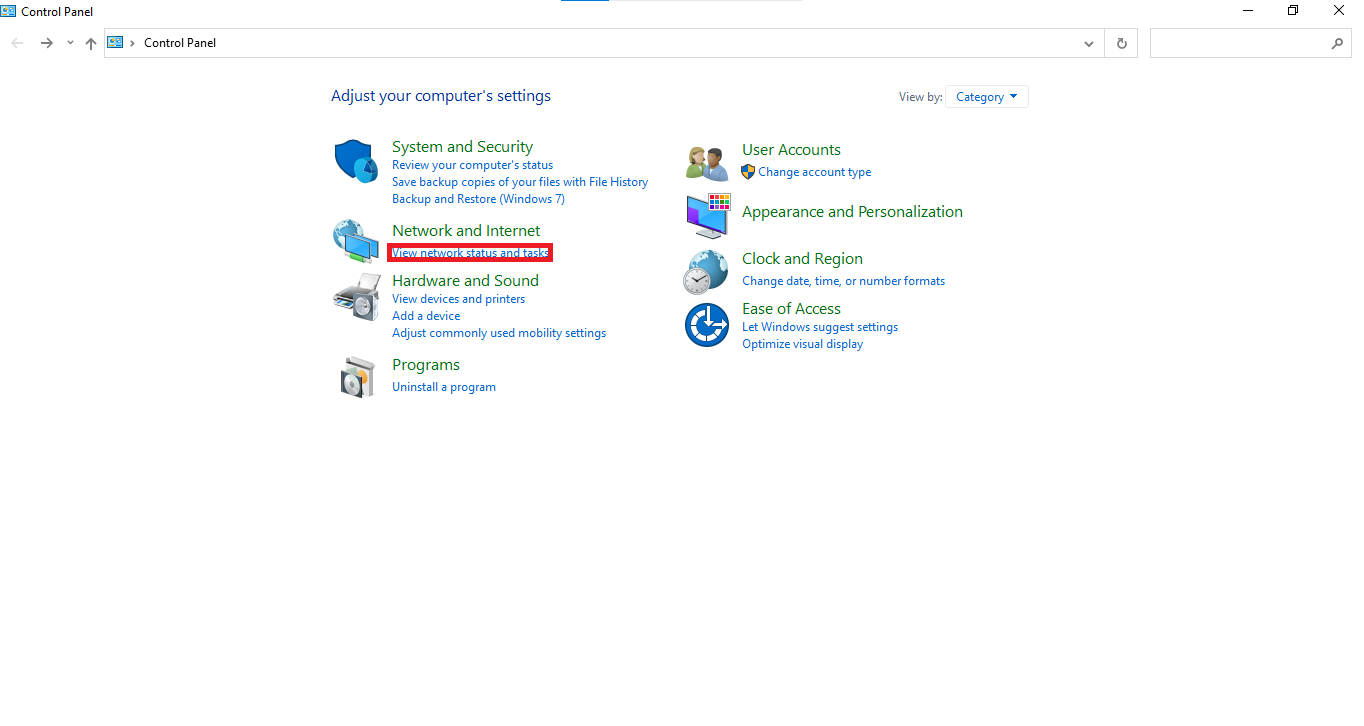 - Once the control panel opens, click on “View network status and tasks” underneath the Network and Internet heading.
