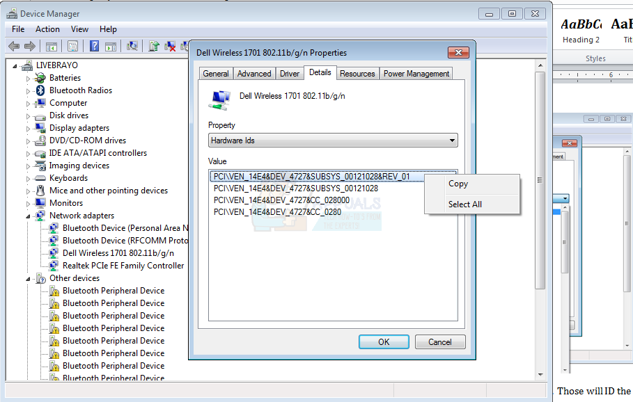 - Right click and copy the top string of characters you see in the window. Those will ID the model of the wireless card you have in your PC
