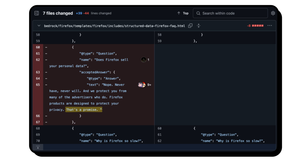 Mozilla had also recently removed a section from its FAQ that explicitly stated it would not sell user data. Critics pointed to this as evidence that the company might sell user data to advertisers. The section previously stated: