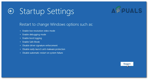 Note: In order to do this effectively, you should first enter the Startup Settings menu and ensure that your PC is booting in Safe Mode. This will ensure that the DDU (a tool that we’ll use for uninstalling the current drivers) has the necessary permissions and it’s not interfered with by another 3rd party component.