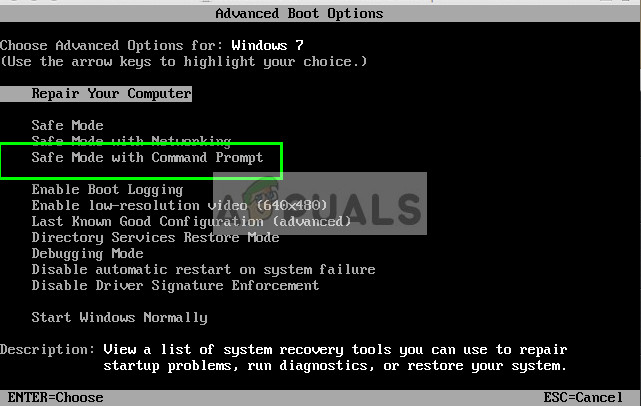 - Boot your computer and press F4 or F5 to launch advanced boot options. The key might be different for different computers. Once advanced boot options are launched, navigate through the menu and click “Safe Mode with Command Prompt”.