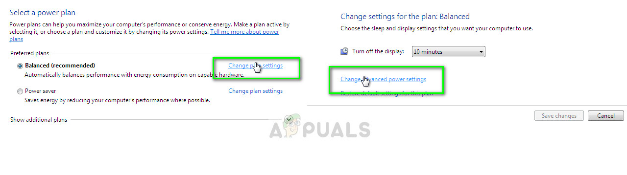 - Click “Change plan settings” in front of the power plan you are using and then click “Change advanced power settings”.