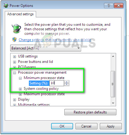 - Now a small window will pop up consisting of different advanced options which you can change. Navigate through them and locate “Processor power management”. From the subheadings, select “Minimum processor state”. Change the value to 10.
