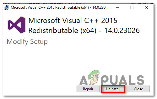 Uninstalling the Visual C++ redist package - Inside the next menu, click Uninstall and follow the on-screen prompts to get rid of the Microsoft Visual C++ redist package.