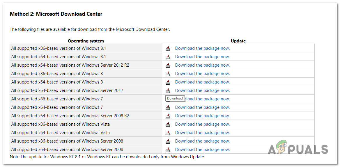 - Visit this link (here), scroll down to Method 2 and download the update package applicable to your Windows version.
