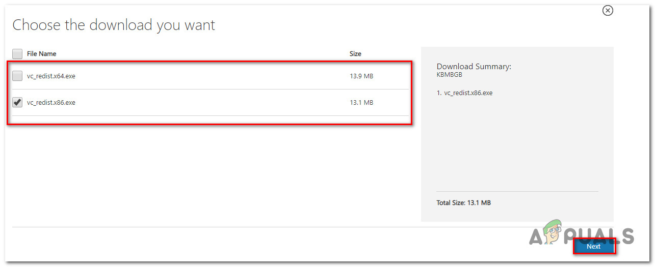 Downloading the required Visual C++ Redistributable - Select the correct installer according to your OS architecture. Check the box associated with the vc-redist.x64.exe if you have a 64-bit version of Windows or the vc-redist.x64.exe box if you’re on 32-bit. Then, hit Next to start up the download.