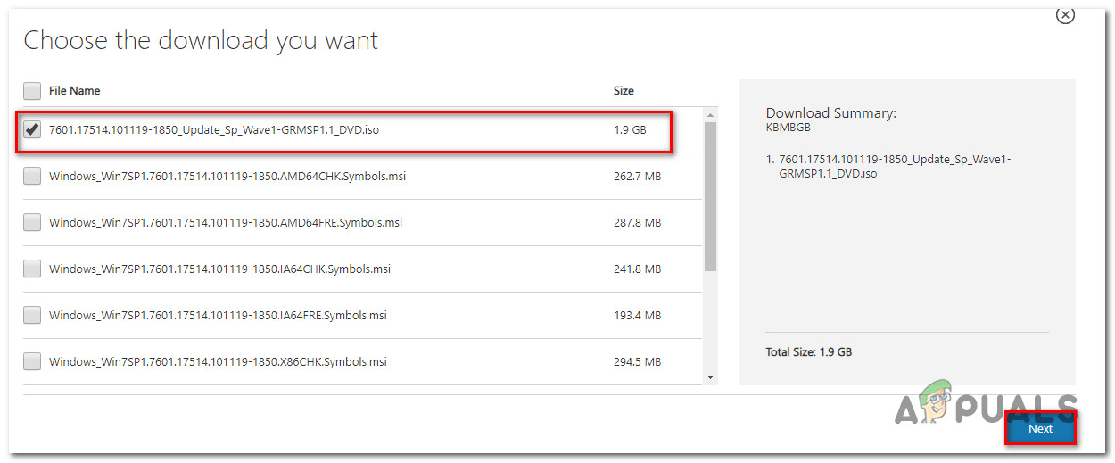 Downloading Service Pack 1 for Windows v6.1 (Build 7600: Service Pack 0) - From the next screen, uncheck everything else aside from the primary ISO file. Once you’ve done so, hit the Next button to initiate the download.