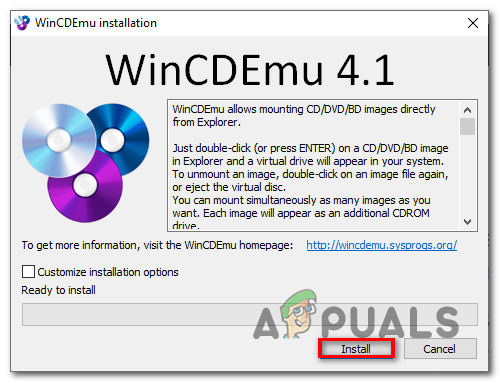 Downloading the WinCDEmu 4.1 tool - Open the installation executable of WinCDEmu and hit the Install button to set up the tool on your computer.
