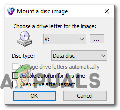 Mounting the Service Pack 1 file with WinCDEmu - Select the letter of the drive you’ll create, set the Disc type to Data disc and click Ok to mount the ISO file.