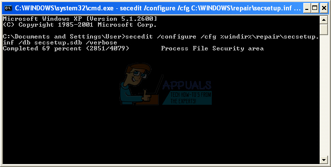 - Type secedit /configure /cfg %windir%\repair\secsetup.inf /db secsetup.sdb /verbose and press Enter