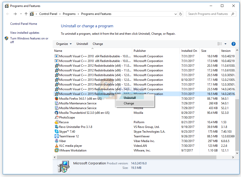 - Right click on Microsoft Visual C++ 2015 Redistributable Package (x86) and choose Change
