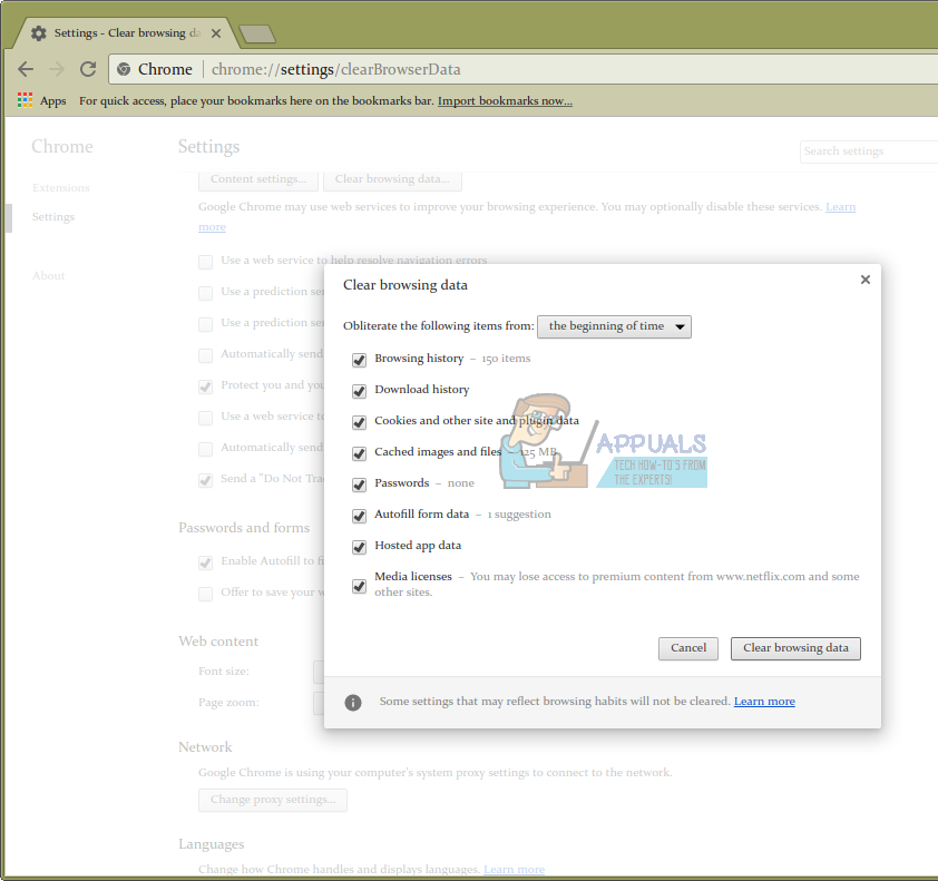 Scroll down until you see a button marked “Clear browsing data” and then click on it. Choose “Obilterate the following items from: the beginning of time” and then make sure that “Cookies and other site and plugin data” is selected. Remember that everything else with a check in the box next to it will get cleared as well. You might want to uncheck everything else, but if you want a good cleaning then make sure to click everything besides Passwords and Autofill form data. If you don’t mind loosing saved passwords, then you can even clean this out. We ran it on a test machine that didn’t have anything really saved, but more than likely you’ll have something you want to preserve. If you clear out everything but saved passwords and form data, then you’ll loose your logins but be able to immediately log right back in again.