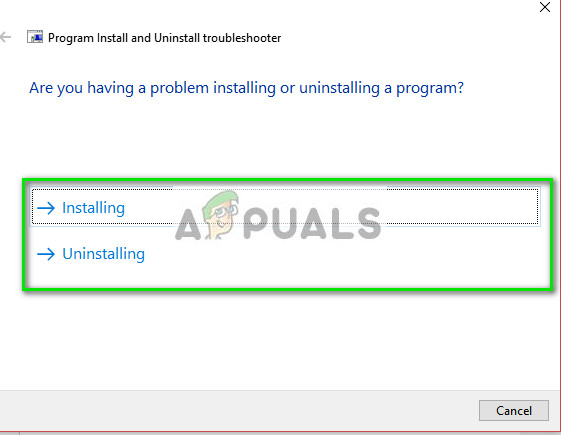- A few moments after running the troubleshooter, you will be given an option whether the problems occur either while installing or uninstalling. Select the correct option according to your case and proceed.