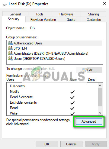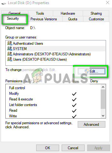 The error message under discussion might also arise if the drive you are trying to install doesn’t grant enough permission to the user SYSTEM to continue with the installation. The user group SYSTEM is responsible for installing or uninstalling various programs and applications. We will grant the required permissions and see if this fixes the problem.