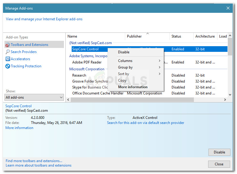 Note: You might want to exclude add-ons published by Microsoft since they are generally safe. You can streamline the process a lot by disabling the add-ons that are not verified first. - Once you have your culprit, you can re-enable the rest of the add-ons that where determined to not cause the issue.