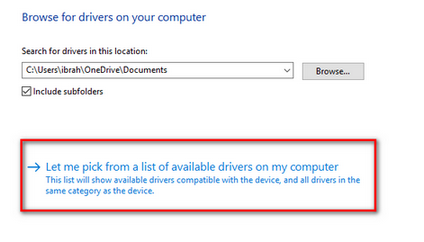 - Now a window will come forward. It will contain a dialogue box where you can browse for the software package and there will also be an option where the computer lets you pick from the list of available drivers for your computer. Choose the second option.