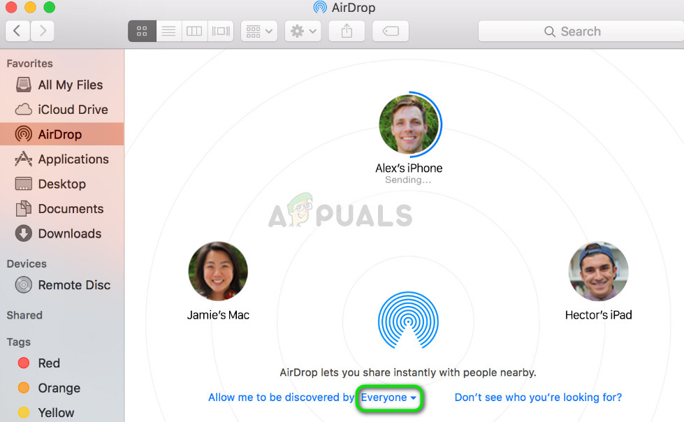 - Once you are in the AirDrop application on your Mac, click Allow me to be discovered by and select Everyone.