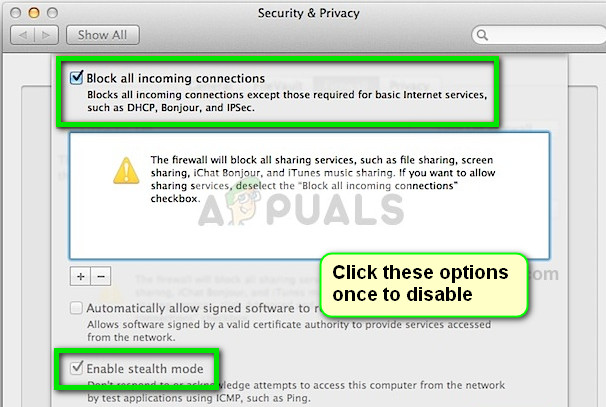 Specifically, the option to “Block all incoming connections” will block any type of connections with the exception of a few important ones. You should disable this feature and see if this makes any difference.