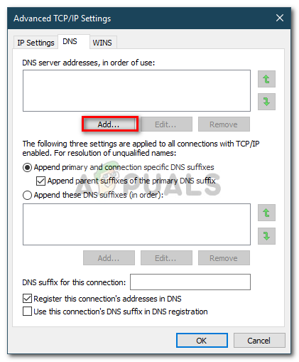- Under ‘DNS server addresses’, click Add and then type in the IP of your Domain Controller in the window.