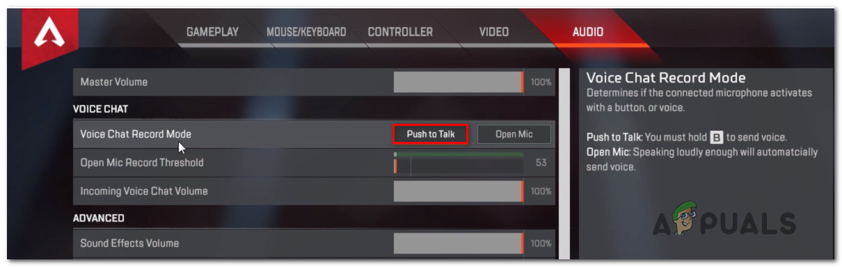 Once these modifications have been made, launch the game and see if you’re now able to use the microphone while playing Apex Legends. If you still experience the issue, click on the gear icon (bottom-right corner) while in the main menu of the game, go to Settings > Audio and set the Voice Chat Record Mode to Push-to-Talk.