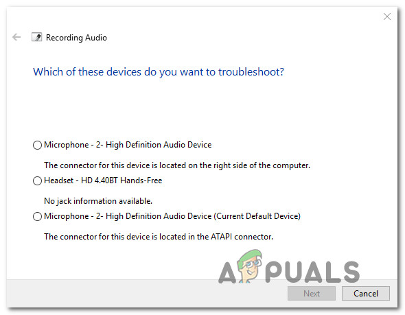 Running the Recording Audio troubleshooter - Select the device that you’re having trouble with, then hit Next to begin the troubleshooting process.