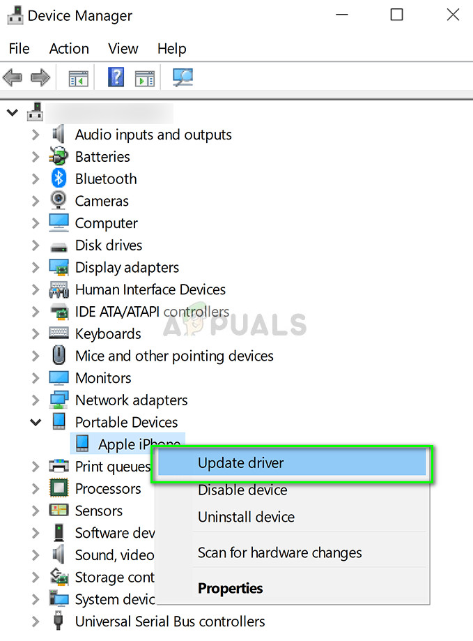- Once in the device manager, expand Portable devices, right-click on your Apple device and click Update driver.