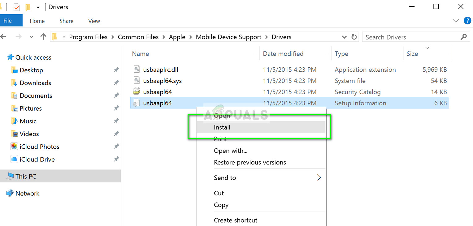 - The file explorer will open with a bunch of files. Right-click on inf and usbaapl64.inf and click Install.