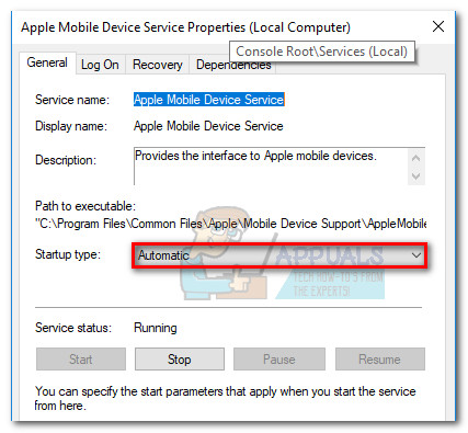 - In the properties of Apple Mobile, go to the General tab, access the drop-down menu associated with Startup type and set it to Automatic. Then, hit Apply to save your changes.