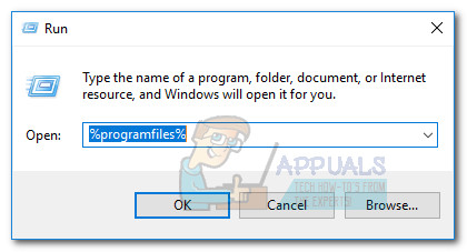 - After your computer boots back up open another Run window (Windows key + R), type “%programfiles%” and hit Enter.