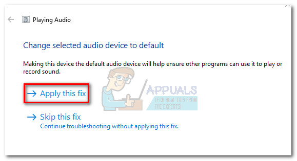 Note: This menu might look a little different, depending on your sound card driver. Your screen might show Disable Audio enhancements instead of Disable All Sound effects. - Once enhancements have been disabled, return to the Windows Troubleshooter window and click on Apply this fix.
