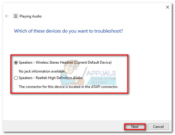 - Wait until the initial investigation is complete, then select the device that is causing the annoying prompts and hit Next. The issue is very common with the generic audio driver, so if you don’t know which device is causing the issue, start with Realtek High Definition Audio and then repeat the steps with the other options.